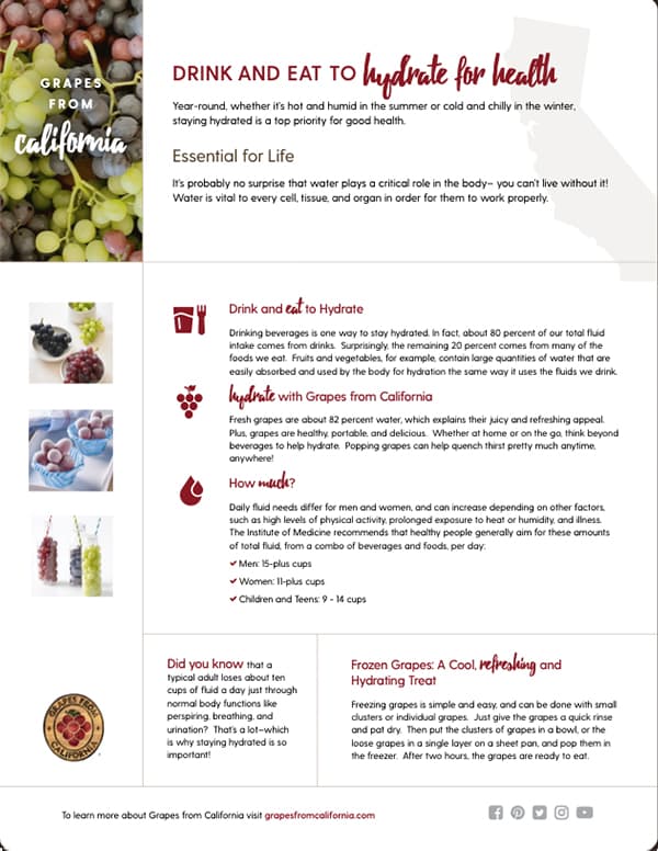 Included below are printable fact sheets that provide information about grapes and health, from grapes and an active lifestyle, to grapes and hydration, to grapes and weight management, and more.
