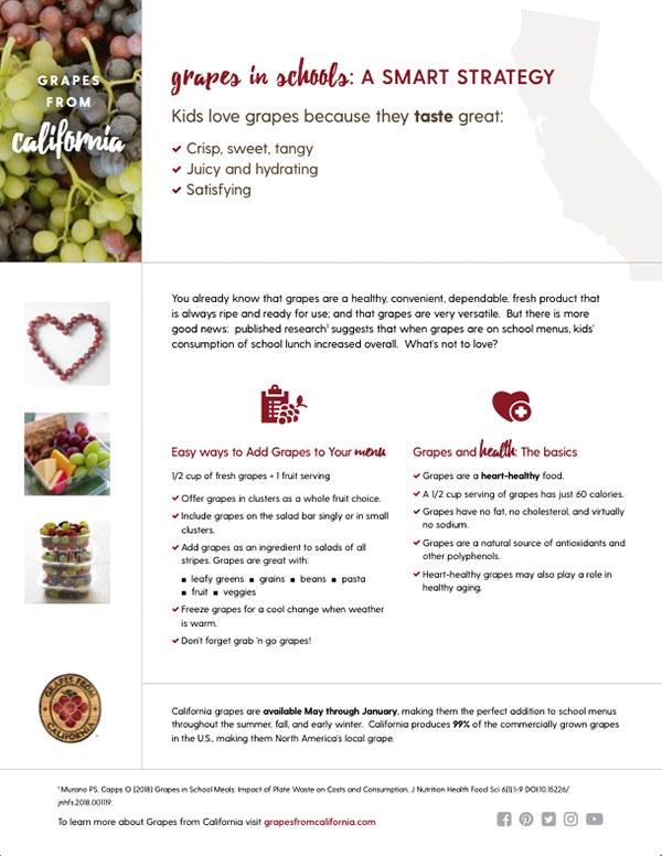ou already know that grapes are a healthy, convenient, dependable, fresh product that is always ripe and ready for use; and that grapes are very versatile. But there is more good news: published research1 suggests that when grapes are on school menus, kids’ consumption of school lunch increased overall. What’s not to love?